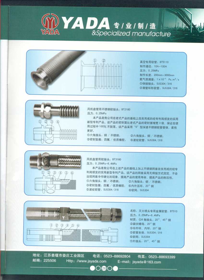 秉天時 籍地利 仰人和 虔誠一個永恒的理念,創(chuàng)新永續(xù).百諾不如一信,亞達人堅持以信為本,視客戶如同上帝,把對信譽的追求,體現(xiàn)在嚴格的質(zhì)量控制和完善的客戶服務上,讓客戶百分之百滿意是亞達人不變的信念。 本廠系ISO9001質(zhì)量認證企業(yè)、計量合格企業(yè)。本廠專業(yè)致力于生產(chǎn)不銹鋼金屬波紋軟管、超高壓、高壓膠管、波紋管補償器(膨脹節(jié))、立式、臥式、冷卻器。本廠產(chǎn)品具有承受壓力高、彎曲半徑小、抗疲勞性能強、使用壽命長等特點。廣泛應用于電力、石化、冶金、水泥建材、工程機械、礦山及液壓系統(tǒng)。產(chǎn)品暢銷全國各地。 今日亞達之成功源自諸多客戶的厚愛,明天的輝煌更離不開您對我的支持與信賴。查看更多>>